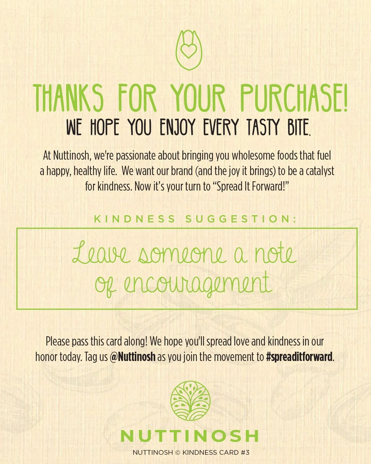 This little “kindness card” reminds people to do good with every order…all while subtly reinforcing Nuttinosh’s brand statement.